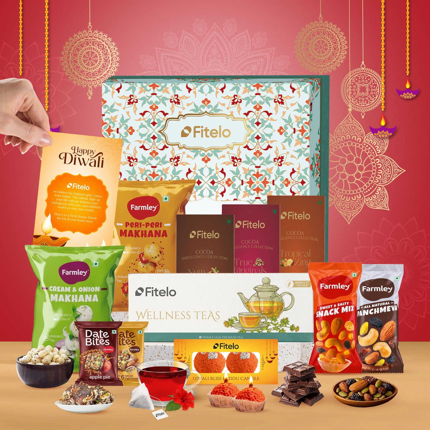 Fitelo Premium Diwali Gift Hamper | 23-in-1 Healthy Gift Box with Sugar Free Chocolates, Herbal Teas, Dry Fruits, Makhana, Candles & Greeting Card