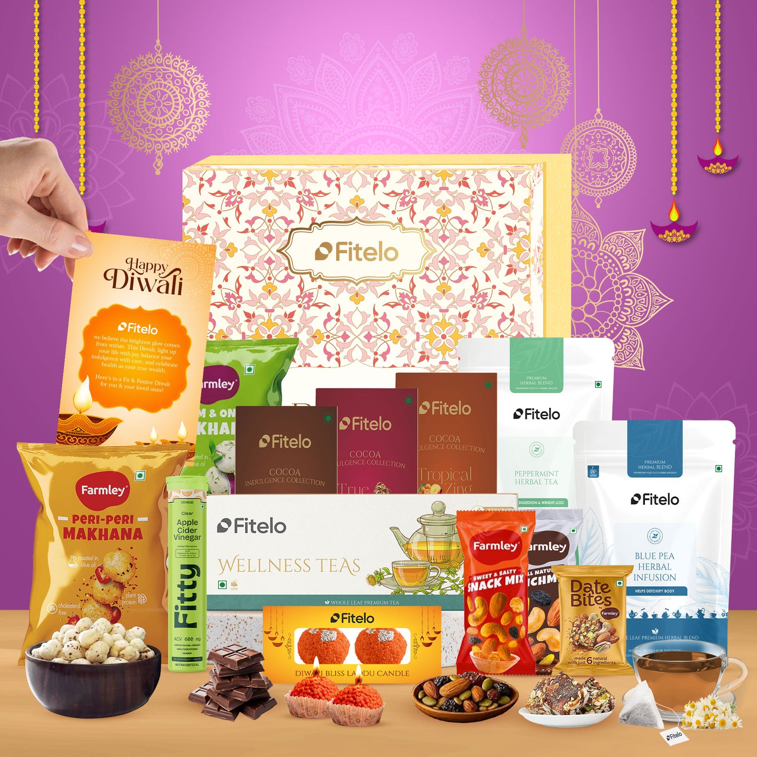 Fitelo Luxury Diwali Gift Hamper | 25-in-1 Healthy Gift Pack with Sugar Free Chocolates, Herbal Teas, ACV Effervescent, Dry Fruits, Makhana, Candles & Greeting Card